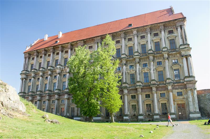 Fasádní výzdoba zámku je z architektonického hlediska velmi zajímavá. Část zámku, která je obrácená k rybníku, je velmi jednoduchá, ale ta druhá strana směrem k nádvoří působí dojmem honosného paláce - má bohatou štukatérskou výzdobu, zdobí ji trojí sloupořadí po 18 předsunutých sloupech.