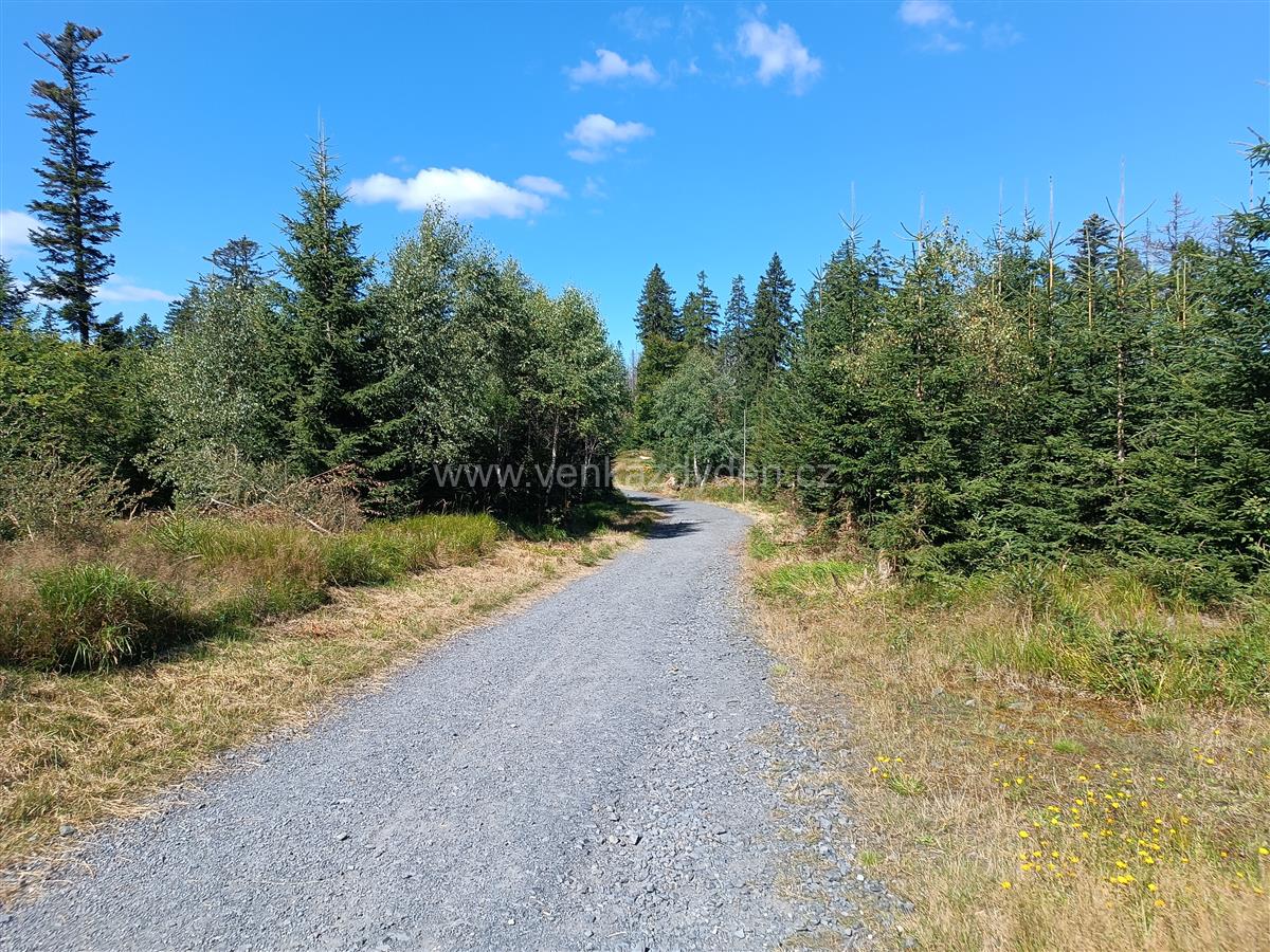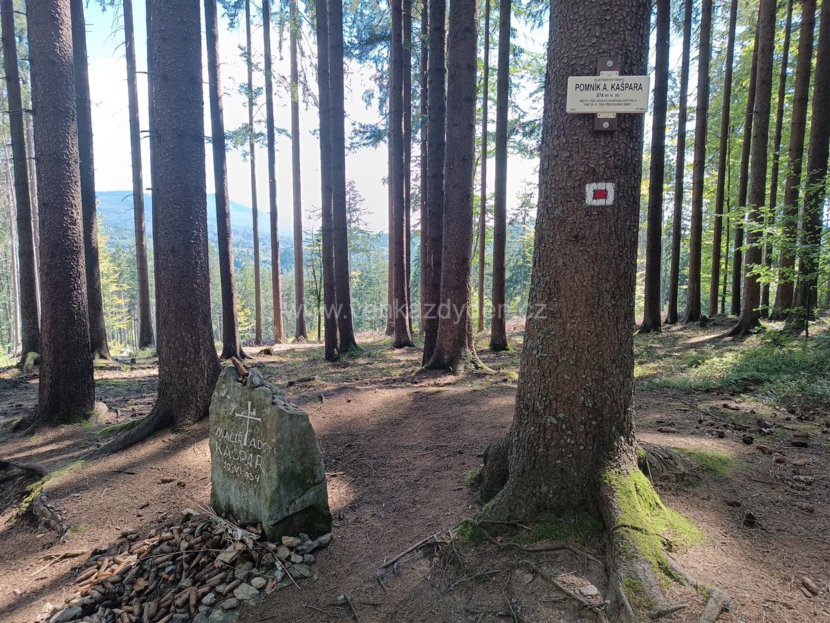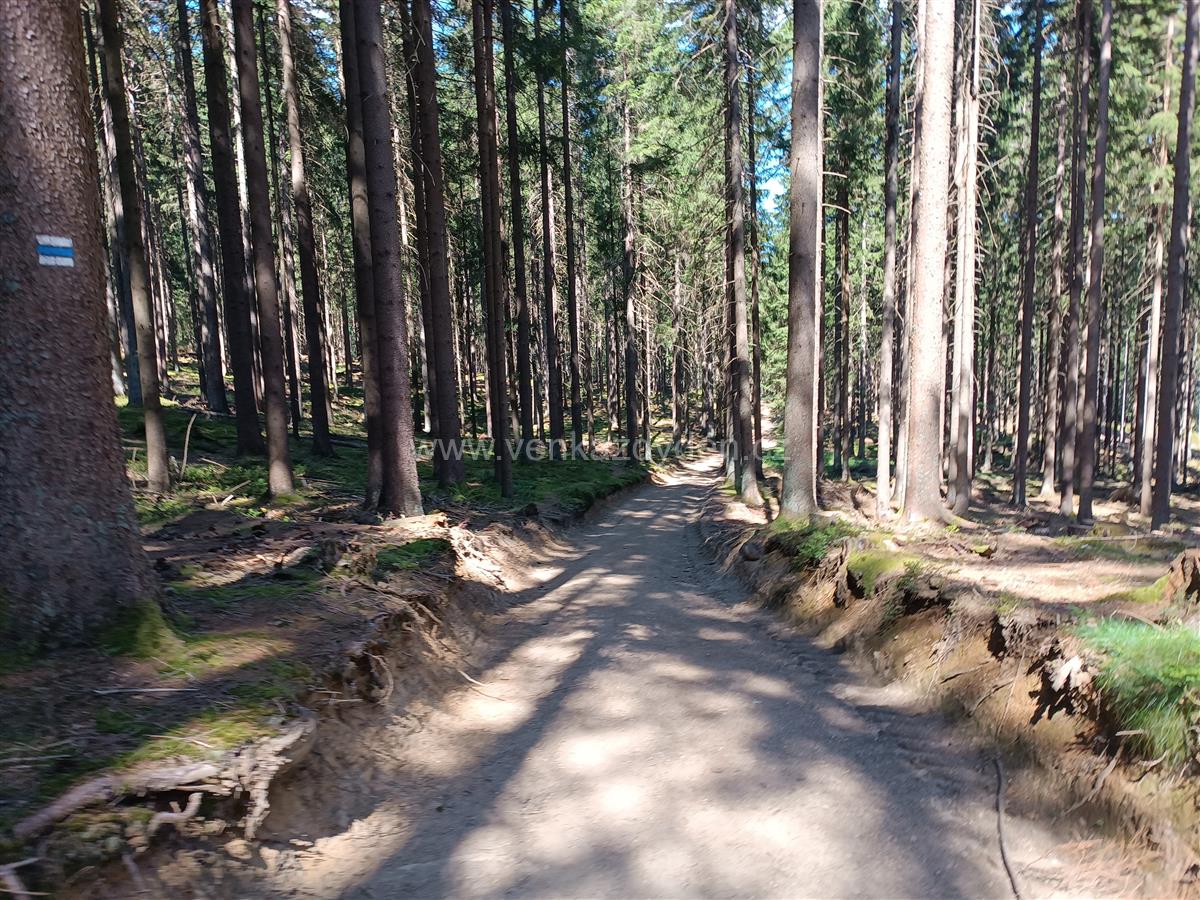 Od jezera se můžeme vydat po žluté nebo červené TZ - my volíme červenou a mírným stoupáním se dostáváme zbytky lesa na další asfaltovou silnici. Po této trase je vedena i trasa Stezky Českem, nebo dálková Via Czechia jižní větev. Následují vcelku nezáživné 3 km po rovině nebo mírným klesáním vzrostlým smíšeným lesem avšak stále po asfaltu - výhledy žádné, vcelku nuda. Proto na rozcestí u pomníku Adolfa Kašpara uhýbáme z asfaltu a pokračujeme po modré TZ. Trasa vede po příjemné lesní cestě s možností sběru borůvek, přes zelené louky stálým mírným klesáním až na okraj Železné Rudy.