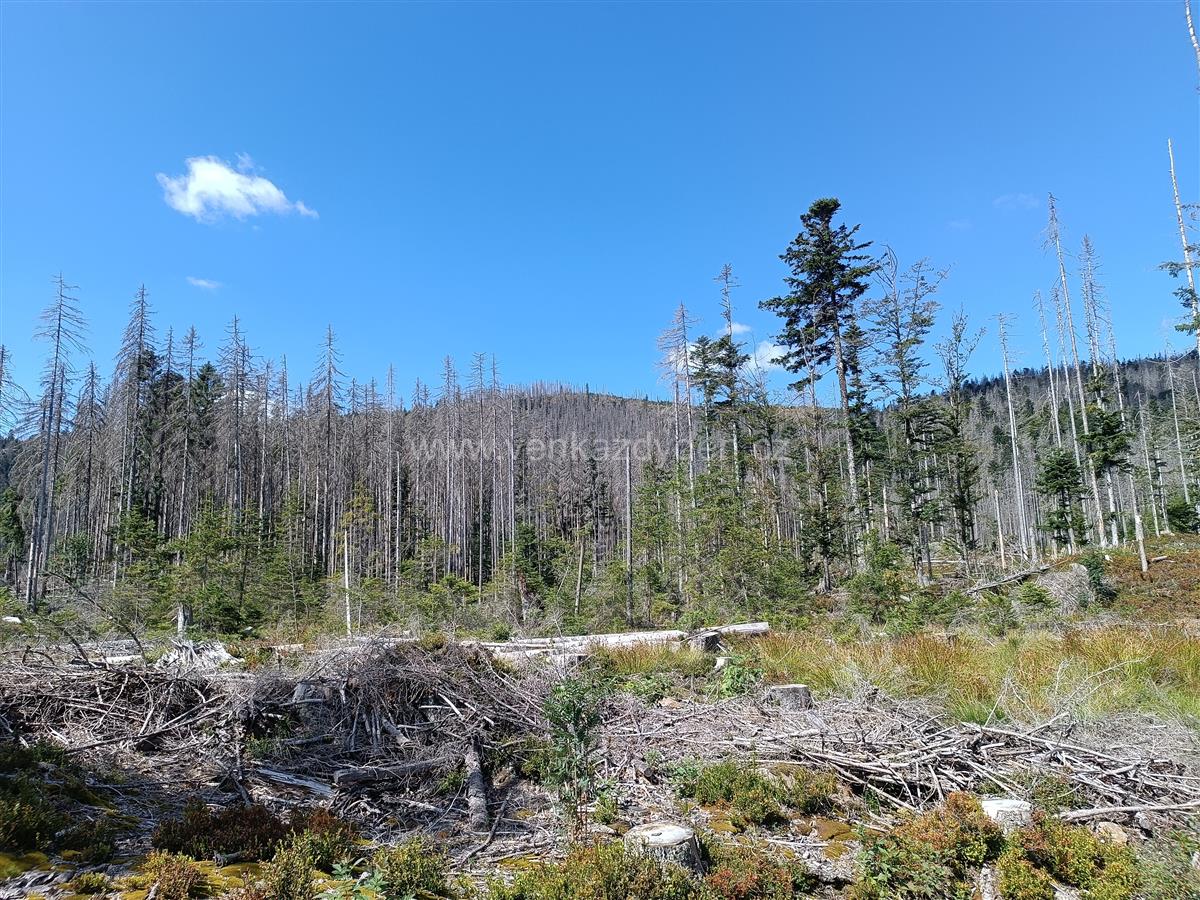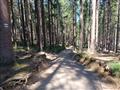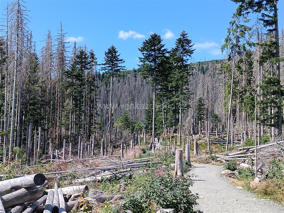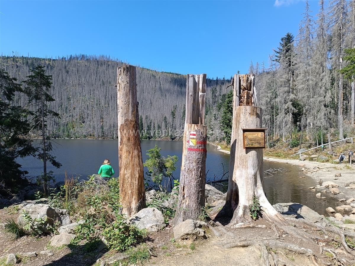 Poté pokračujeme po asfaltové neznačené cestě na rozcestí Pod Malým Špičákem, kde uhneme doleva a po červené TZ směřujeme k Čertovu jezeru. Cesta vedla původně vzrostlým smrkovým lesem, díky kůrovcové kalamitě v minulých letech však procházíme jen torzem lesa - suchými stromy, někde již vlivem větrných smrští zlámanými a popadanými. Lesní cestou plnou kořenů a pařezů scházíme dolů a po cca 1km přicházíme k břehům Čertova jezera - viz samostatný výlet.