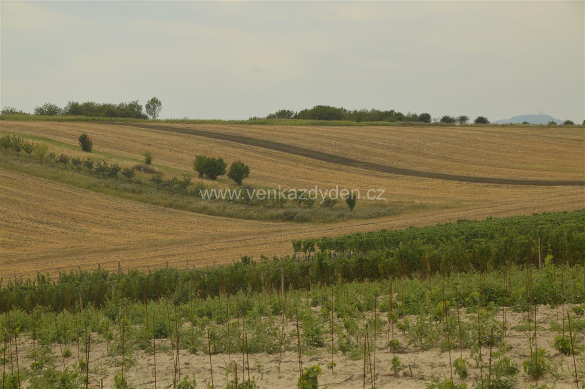 Naše cesta vede po zpevněné silnici, zprvu procházíme pod dálničním mostem a vydáme se mezi vinice Pod Novými horami a Ostrovce. Zde je křižovatka, doleva byste se dostali k rozhledně U Obrázku, "ukázkové" vinici a také k unikátním Božím mukám z 15. století, ale my pokračujeme doprava mezi další vinice. Podle informací se zde pěstuje hlavně modré víno a to odrůdy Frankovka, Svatovavřinecké a Modrý Portugal. Z bílých pak to jsou Veltlínské zelené, Tramín nebo Neuburské. Vznikla tu odrůda vína André a to díky křížení odrůd Svatovavřinecké a Frankovka.