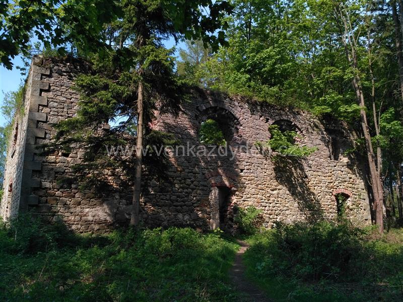 Po krátkém odpočinku opouštíme značenou cestu a míříme doprava k lesu na Kopeček. Cesta není značená, ale určitě se zde neztratíte. Na vrcholu Kopečku (587 m n. m.) se nachází zřícenina kostela Panny Marie. Bývalý poutní kostel má své kouzlo a rozhodně doporučujeme si k němu vystoupat. Na jeho místě původně stála dřevěná kaple, později nahrazena tímto barokním kostelem, který bohužel kvůli odlivu poutníku postupem času zcela zchátral a nakonec z něj byla z bezpečnostních důvodů sejmuta střecha. Pokud sebou máte kočárek, musíte se u kaple vystřídat, na Kopeček to s kočárkem nezvládnete. Zpět se vracíme stejnou cestou.